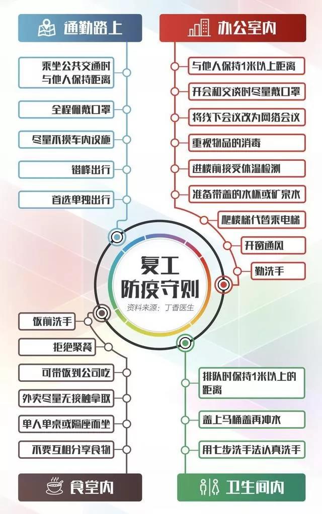 本周開始大批企業陸續複工、商場開門、市場開市,回歸日常工作生活節奏。複工之後,企業和員(yuán)工應如(rú)何防控疫情?辦公室如何消(xiāo)毒,收好下麵的複工守則關鍵信(xìn)息一目了然↓↓↓