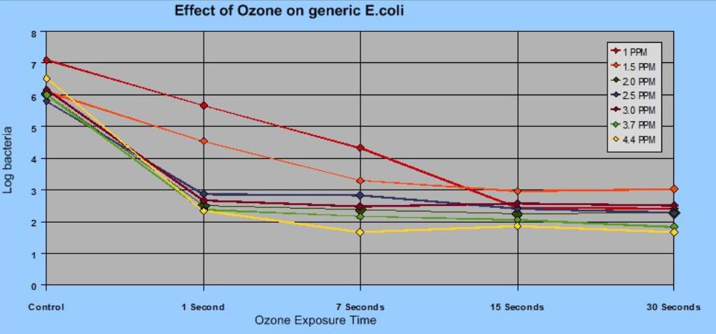 臭氧水平通常為2.0 ppm,用於減少O157:H7大腸杆菌。滅活(huó)僅需要臭氧與病原體接觸幾秒鍾的時間。見下(xià)圖。